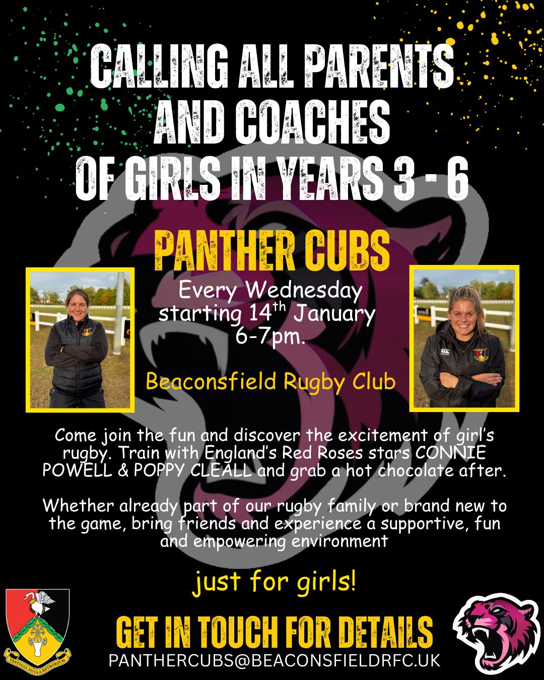 On Wednesday the 14th, at 6pm until 7pm we have a girls open session for girls in years 3-6. The session will be run by England Red Roses stars Connie Powell and Poppy Cleall, with hot chocolate served in the clubhouse post the event. Whether you have played already or are completely new to the game, bring friends and experience a supportive, fun and empowering environment. Any questions reach out to panthercubs@beaconsfieldrfc.uk